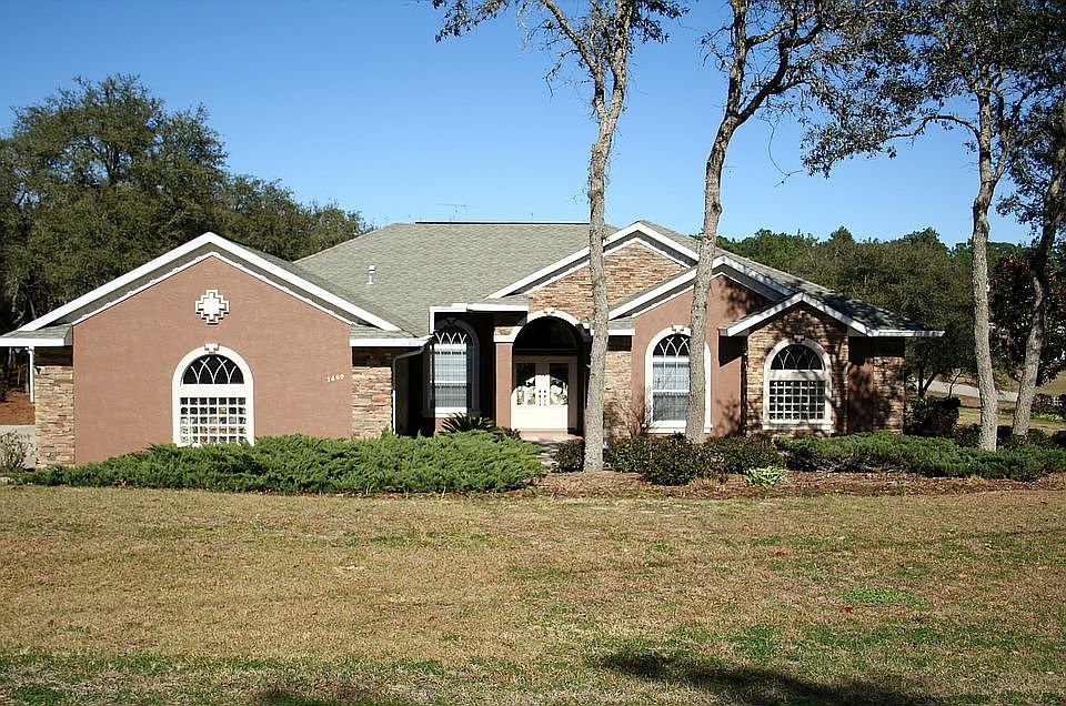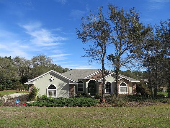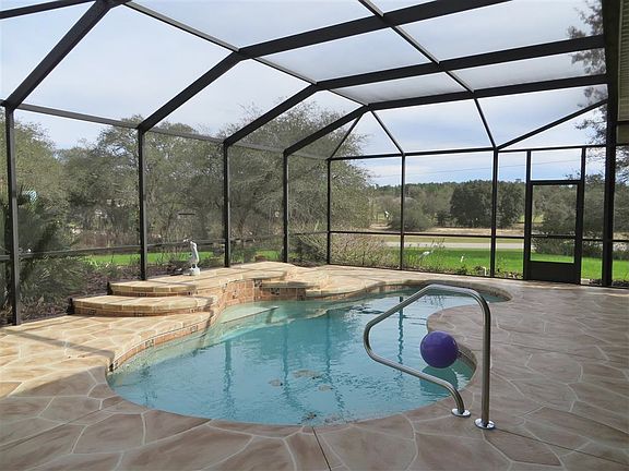 This home has more than Curb Appeal! Much thought and planning went into this home and it shows. As soon as you arrive via the circular drive with lighted stone columns you will be greeted by the beautiful stained glass double doors. Step inside to the living room & formal dining area with beautiful tile floors in a diagonal pattern which flows into the kitchen area with breakfast nook and Family room with gas fireplace and views of the gorgeous heated pool with upgraded stone work. Even a master chef would appreciate the kitchen with Corian counter, quality wood cabinets and top of the line appliances to include a full freezer/refrigerator combo. French doors open to the m aster suite with a luxurious bath & private office. Bedroom 2 & 3 are split from the master and are separated by the hall bath. There is also a 16X12 bonus room with cabinets & sink with a door to the paver patio where you can sit and relax while you watch your pets frolic in the fenced yard. This expansive home has storage galore and is located on a 1 acre corner homesite with view of golf course across the street. All located in Pine Ridge Estates with amenities to include, golfing, tennis, clubhouse, Equestrian Center & 29 miles of community trails. Come see all this home and community have to offer!!