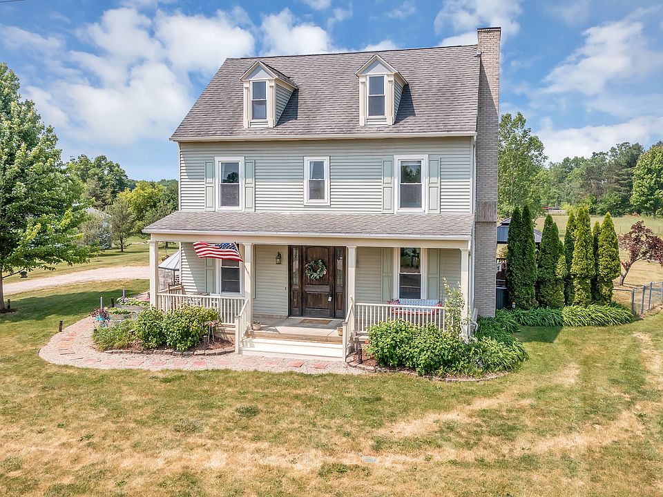 Sharp modern farmhouse with an ideal country setting! Classic house vibes with today's conveniences. This 3-story home offers maintenance free vinyl siding, classic front porch elevation, and a gorgeous custom front door. Exposed hardwood floors and 9 ft ceilings t/o the entry level. Formal living room with tons of natural light from all of the windows and a cozy gas fireplace. The open floor plan also features a large dining room. A chef would be proud of this kitchen. Loaded with cabinetry (glass uppers), granite countertops and upgraded appliances. 1st floor laundry room and powder room complete level 1. Upstairs you'll find 3 spacious bedrooms including a spoiling primary suite with luxurious bathroom featuring a jetted tub, separate Euroglass shower and dual sink vanities. Up one more flight to the massive 3rd floor bedroom/flex space with hardwood floors, or pass through the hidden door in the primary bedroom's closet to another flex space/home office (also accessible from the entry level mud room). The basement is finished with a fabulous rec. room and equally fun pool hall/pub side. (Pool table stays). Outside boasts 2.4 acres of land. The deck is partially pergola covered for the ideal place to watch over your fenced back yard. If gardening is your thing, you won't have any issues finding the spot. Other features and updates include: whole house generator, shed, 2 car attached garage (extra deep), brand new water softener, furnace and AC (2019), and top-of-the-line septic system.