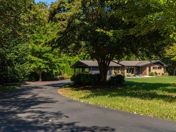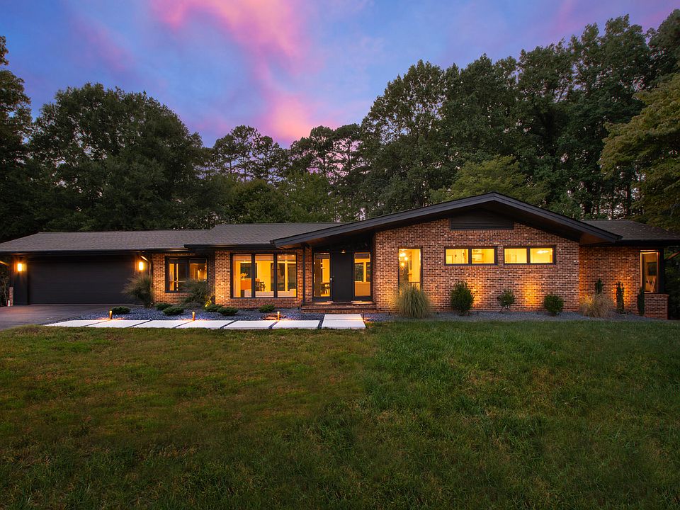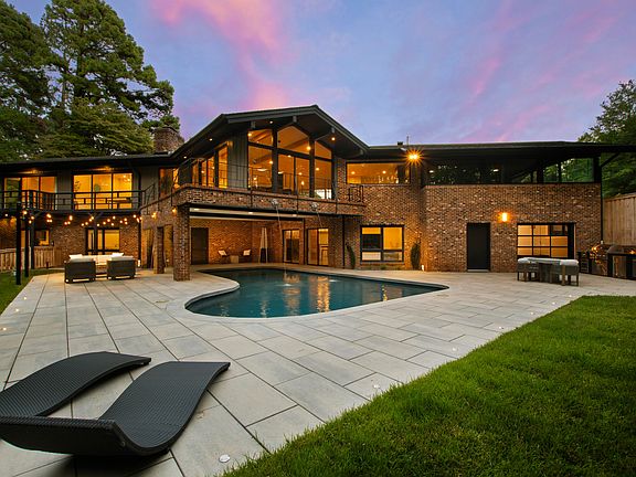 Nestled on a serene 2.87-acre lot, this exquisitely renovated mid-century modern masterpiece provides ultimate privacy,courtesy of an abundant tree canopy in the backyard. Featuring 4 generous bedrooms and 3.5 baths, this home has experienced a remarkable array of upgrades.The airy main level is bathed in natural light, with large windows and white oak floors flowing throughout. The kitchen, a blend of functionality and beauty, is equipped with a spacious island, a prep sink, upscale Jenn-Air appliances, a gas stove top, and a wine fridge. In the living and dining areas, vaulted ceilings adorned with wooden beams complement a modern gas fireplace and sliding doors that lead to a terrazzo balcony overlooking a dramatic pool. Both the primary suite and second bedroom enjoy access to the balcony and secluded backyard.The walk-out basement features polished terrazzo flooring and an additional living space that opens to the pool through sliding doors. This entertainment oasis includes a wet bar fitted with a wine/beverage refrigerator, ice maker, dishwasher and sink. Accommodating guests, there are two spacious bedrooms, one boasting a sliding door with a built-in dog door that opens to a fully fenced, turf-covered backyard. A laundry room adds convenience with ample storage and folding areas, along with an extra bathroom.The adjoining pool house contains a half bath, a living space with kitchen amenities, a mud bench, utility sink and a full-sized refrigerator. A modern glass garage door effortlessly links this area to the outdoor kitchen and pool, enhancing the seamless indoor-outdoor lifestyle.The backyard is perfect for entertaining, featuring newly installed pavers, a complete outdoor kitchen equipped with a grill, pizza oven, refrigerator, and granite counters, all complemented by a sparkling pool, adorned with pebble plaster and fountains, plus a partially-sheltered seating area. Surrounded by a fence, the improved landscaping and subtle lighting create a cozy atmosphere for evening gatherings. Additional features include a two-car garage and a separate storage shed. Ideally located just minutes from Crabtree Valley Mall, North Hills, Shelley Lake, the airport, and a variety of local amenities.