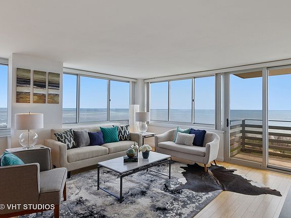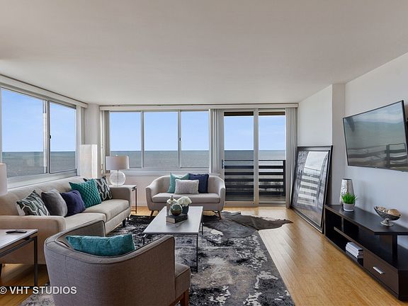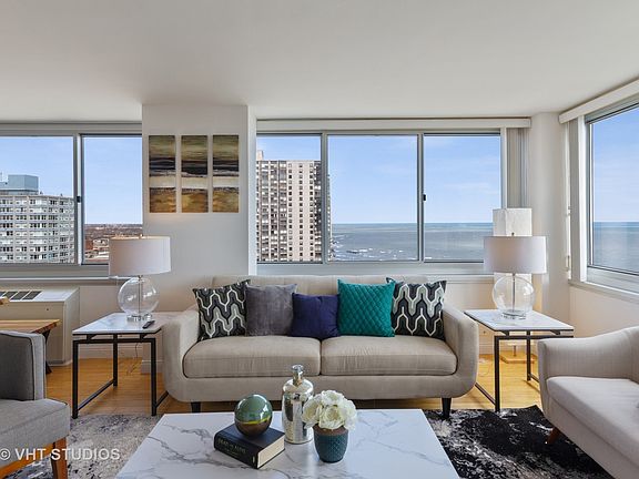 Unparalleled, panoramic Lake Michigan, city skyline and Lake Shore Drive views. This combined unit at 2,000 sq. ft. provides an open floor-plan with generous living space, three large bedrooms, and three full bathrooms. Kitchen has 42' cherry cabinets, stainless appliances, granite countertops+backsplash and built-in wine cooler. There are two ensuite master bedrooms: one with custom built-in cabinets, fireplace, southern-view terrace, master bath whirlpool tub and separate shower; the other with a dedicated den, southeastern-view terrace, and fully rehabbed master bath featuring an electronic commode. Two large terraces have lake, city and park views. Two storage units included and two parking spaces available. Just a short walk to the Red Line, Lake Michigan, Foster Beach, Margate Fieldhouse, Mariano's and Starbucks.