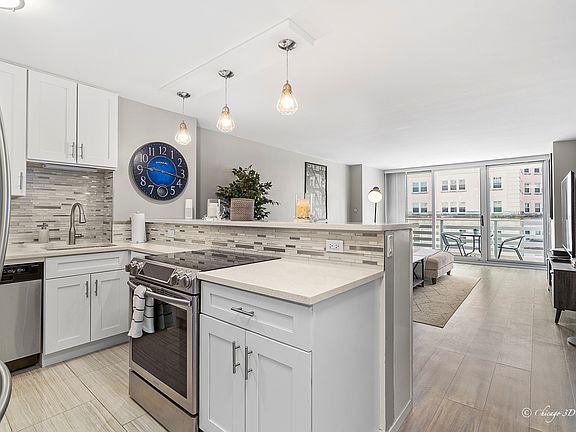Prepare to be blown away by this stunning, fully gut-renovated 1-bedroom, 1.5-bath luxury condo in one of Edgewater's most iconic lakefront high-rises. Perfectly perched above the treetops, this southeast-facing home is drenched in natural light and offers breathtaking partial views of Lake Michigan, framed by sleek, floor-to-ceiling glass sliding doors. From the moment you walk in, you'll notice every inch of this space has been reimagined with high-end finishes, thoughtful design, and flawless execution. The open-concept layout is ideal for modern living, while the oversized primary suite offers a peaceful retreat with generous closet space and its own spa-inspired en-suite bath. The chef's kitchen is magazine-worthy-featuring custom 42" white shaker cabinetry, quartz countertops, Samsung stainless steel appliances, and a striking mosaic backsplash. Whether you're cooking dinner for one or entertaining friends, this kitchen sets the stage for unforgettable moments. Every detail has been upgraded-from the 100-amp electrical panel and copper plumbing, to designer silver-tone flooring, elegant baseboards, all-new doors and hardware, and custom window treatments. Both bathrooms are beautifully appointed, with a show-stopping walk-in shower clad in porcelain and mosaic tile. Step out onto your private 14x6 balcony and take in the breeze off the lake. Grill with gas or electric, host wine nights, or simply unwind-it's your personal sky oasis. And just steps away is Chicago's stunning lakefront trail, giving you immediate access to miles of scenic walking, running, and biking along the shoreline. The building features heated garage parking, secure elevator access, and monthly assessments that cover water, heat, A/C, cable, and internet, making life here not only luxurious, but incredibly convenient. All this, in an unbeatable location-just blocks to the CTA Bryn Mawr Red Line, Whole Foods, Mariano's, Loyola University, the beach, and the endless dining and shopping options of Andersonville and Edgewater. Quick and easy commute to downtown via train or express bus. This isn't just a condo-it's a lifestyle upgrade. Pet-friendly, modern, and perfectly located-your dream lakefront home awaits. Unit is coming with a good size Storage locker downstairs.There is also a bike room. Schedule your private tour today-before someone else falls in love first.
