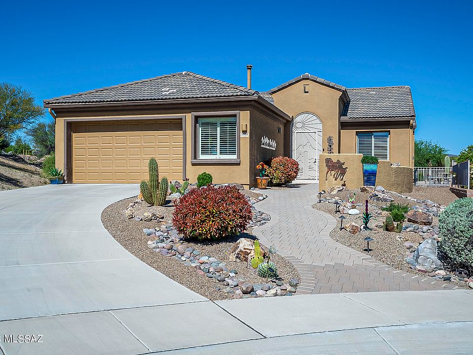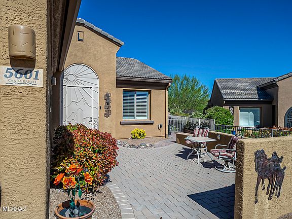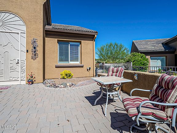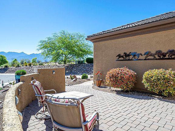 You'll be amazed at the view, privacy, huge backyard and all this former model has to offer! Resting high at the end of a cul-de-sac close to the Canoa GVR center, this 1,784 sq. ft. 2 bedroom, 2 bath, 2.5 car garage home offers a stunning mountain view from the front paver courtyard, a perfect spot to enjoy your morning coffee. Inside, through the enclosed vestibule, it features an open floor plan with ''cook's'' kitchen, a center island housing a raised dishwasher so you don't have to bend to load or unload, a double sink, and beautiful granite countertops. There's a double pantry closet, pull-out shelves in the cherry cabinets, under-cabinet lighting, pendant lighting over the island and stainless appliances. The large Great Room includes a separate dining area with a SE mountain view. Throughout the home, you'll find beautiful tile floors and plantation shutters. The highlight of the Great Room is the gas fireplace and curved TV that conveys with the sale. There's a French Door that takes you to the covered back patio with remote controlled sun shades. Beyond that, the patio is extended with pavers all around to the north side of the house. If you like to entertain, there's plenty of room for all your friends. For the chilly winter evenings, there's a fire pit. If you're a golfer, you can practice your putts on your own putting green. The backyard backs up to a common desert area and the Canoa Ranch golf course. You have to see this property to truly appreciate the privacy, the beauty, the view and the features of this unique home. The primary bedroom is spacious with plenty of room for a king bed and large nightstands, chest of drawers and even a sitting area. Plus, there's a French door to the patio with its own security screen door. The primary bathroom has a large walk-in closet, double shower with bench and double executive height vanities. The laundry room is complete with multiple cabinets and washer/dryer. In the 2.5 car garage, you'll find plenty of storage space. And, you can move the portable shelving to the side wall if you need more depth for a larger vehicle. Overall, this is a great property. Don't pass it by! You'll be surprised at all it has to offer!