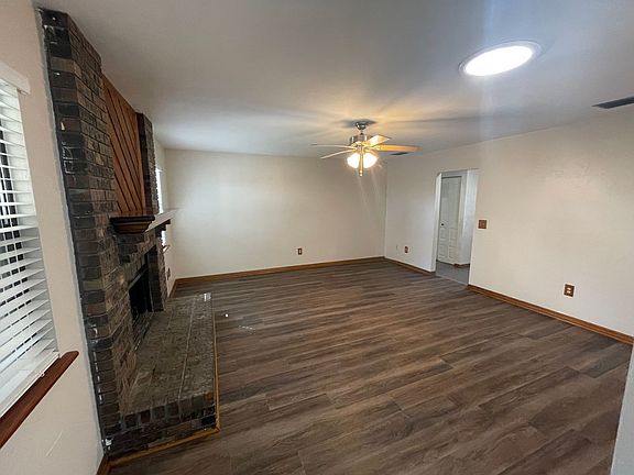 The living room boasts new luxury vinyl plank flooring, updated light fixtures, and a cozy brick fireplace with hearth, mantel, and cedar accent trim. All bedrooms include brand-new carpet, and both bathrooms offer ceramic tile, porcelain fixtures, and a tub/shower combination.