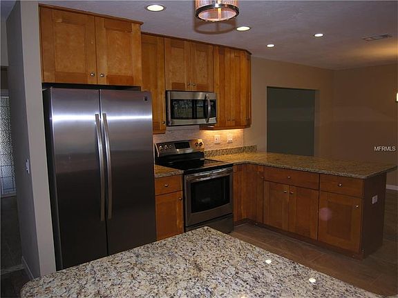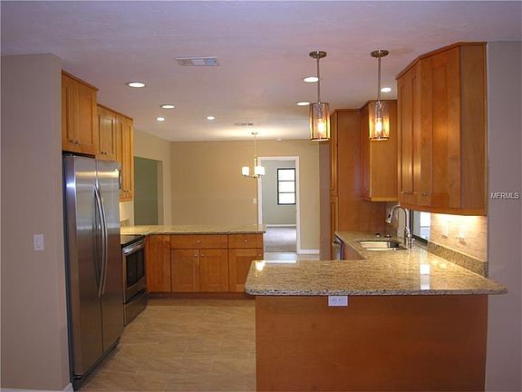 Totally redone with new kitchen cabinets, countertops and appliances. New metal roof. New tile flooring, Landscaping rejuvenated. Beautiful pool area. Large screened covered lanai. 3 bedrooms 2 bathrooms. Formal living room , dining room and family room. Kitchen has breakfast bar. Corner lot with oak trees. Great neighborhood off Bee Ridge and close to I 75. New A/C system and Hurricane Garage door installed in August,