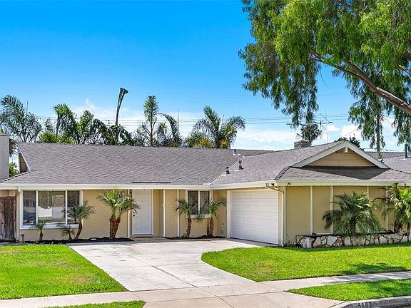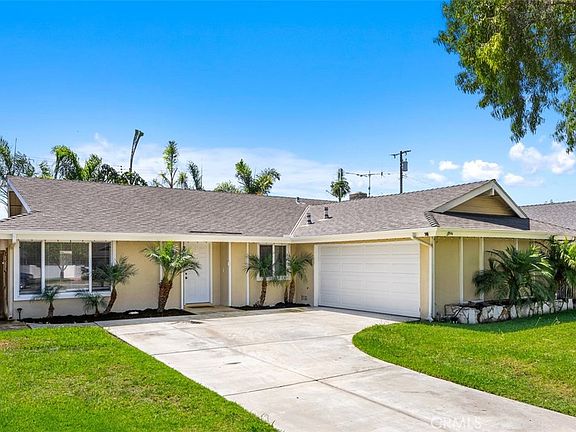 This beautiful beach home resides on a quiet interior tract location lot, while offering really nice curb appeal. There is tropical landscaping, along with a newer driveway + plenty of room to add an RV pad. Once inside, you are greeted by a very open floor plan. The formal living room flows into the large dining room, which features a wood or gas burning fireplace. Next comes the kitchen with updated cabinets, tile counter tops, a new dishwasher and a refrigerator which remains with the house. The guest bathroom has been updated with a new vanity, toilet, fixtures and offers a bathtub/shower, with tiled surround. There are 3 nice sized bedrooms, all with ceiling fans. The primary bedroom is at the rear of the home. The primary bathroom has a tiled shower enclosure and a pedestal sink. There is also an inside laundry room. Bonus features include; tile flooring, smooth ceilings, recessed lighting, updated outlets & switches, new interior paint, dual pane windows & slider, copper plumbing and a 200 amp electrical panel. There is also a private South facing rear yard with a covered patio, grassy area with timed sprinklers, a lemon tree + newer block wall fencing. This lovely home is walking distance to award winning schools, a park, golf, shopping, restaurants and is only a 5 minute drive to the beach or the Bella Terra Mall!