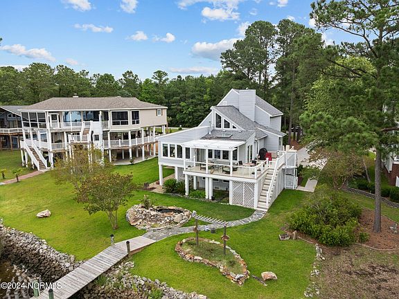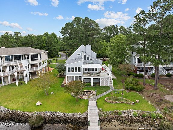 WOW The views are incredible from this spectacular home on the Northwest Creek in Fairfield Harbour!! One of a kind, this open-concept, light-filled waterfront home boasts its own boat dock, slip and absolutely beautiful landscaping including a koi pond and bird feeding arbor. Up the stairs, step through a separate foyer with stone tile flooring, then Inside you'll find hardwood floors (cherry) throughout the main floor and stairs. Vaulted ceilings and walls of windows with views of the water from every room and loads of natural sunlight! Wood Custom Entertainment center in living room with matching shelving will convey with home. Separate Den/Sitting area off of living room offers optional usage for new owners. A gorgeous updated kitchen fitted with an abundant amount of cabinetry, including a cabinet pantry for extra storage, granite countertops, new gas (propane) five burner range and built in microwave. Right off kitchen is laundry room with cabinets, shelving and additional refrigerator that conveys. Dining Room off of kitchen. Step directly into a separate 148sf sun room (not included in overall square footage), currently being used as a home office. Large master suite on main level features spacious custom walk-in closet and incredible newly renovated private bath. Grand walk in shower with unique glass tile waterfall inlay, features two vanity areas and luxury tile flooring. Up stairs over looking the living room is an art walk flooded with natural light. Two generous sized bedrooms on the second floor. Hall guest bathroom completely updated with walk in tile shower and lovely vanity w/granite countertop. Two geothermal HVAC systems installed in 2018, new roof in 2017 (reported by previous owner). Garage level is enclosed with plenty of storage or workshop space and a half bath. Too many features of this home to list here, see copy of special features in listing. Current owners had an outside lift added for easy access to getting in the home.