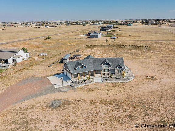 Discover this stylish and spacious home, built in 2020 by Frontier Construction, nestled on 4.69 acres in Cheyenne’s desirable Destin Heights. The main level boasts over 1,900 sq ft with an open floor plan, vaulted ceilings, a spacious kitchen, and a large mudroom with its own bathroom, conveniently located off the expansive 30x38 garage. The main floor also features a generous laundry room near the primary suite, which offers a luxurious bathroom with a wet room. The finished basement is perfect for entertaining, complete with a large living room, overhead projector and screen, wet bar, three additional bedrooms, a 3/4 bathroom, and ample storage. Step outside and enjoy summer evenings on your patio overlooking your private acreage. Schedule your showing today!