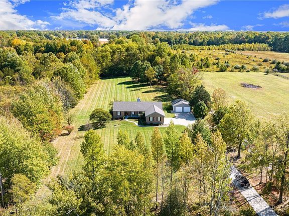 Check out this beautiful ranch set back on 2.89 acres! Featuring a welcoming covered front porch, 3 Bedrooms plus Study, Formal Dining Room, Split Bedroom Layout, Primary Bedroom with Attached Bath & Dual Closets, Hardwood Floors & New Carpet, Kitchen with counter bar opens to Cathedral Living Room with Fireplace & Walkout to Wood Deck. First Floor Laundry! Full Basement with Walkout. 2 Car Attached Side-Entry Garage PLUS a 2 Car Detached 24x24 Garage w/Electric and Concrete driveway to road. Move-In ready!