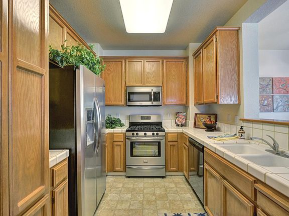 Fantastic location,end unit, with views of the arroyo and park beyond. Very light, bright and clean. Open floor plan with vaulted ceilings, gas fireplace, oak cabinets, tile counters, new hardwood floor, marble floor in bathrooms. Newer heating and A/C Living space on one level with garage below. Indoor laundry includes w/d. Open July 11 & 12th.