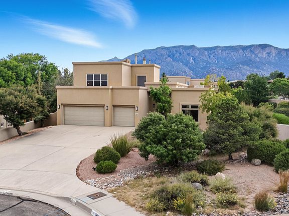 Rare High Desert custom with breathtaking Sandia views inside and out! Perched on a quiet cul-de-sac, this 3,092 sq ft Centex pueblo-style home features radiant-heated flagstone floors, a beamed great room with fireplace, and a chef's kitchen with sandstone counters, double ovens, island, and bar. The main-floor owner's suite is a private retreat with spa bath, while upstairs two bedrooms open to a full-length view deck spanning the entire range. Outdoors, enjoy a .33-acre walled backyard with waterfall, covered patio, and flagstone terrace. Additional highlights include thermal windows and a 3-car finished garage. Just moments from world-class hiking and biking!