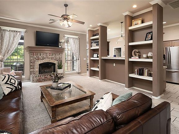 This beautiful home is exactly what you are looking for! The lot backs up to a green space offering amazing views and quiet privacy. Located at the end of a cul de sac means you'll have less traffic on the street. The layout is perfect featuring 3 bedrooms PLUS an office. The living room has a cozy fireplace and awesome built-ins. The master is spacious with split dual sinks, shower, tub, and large walk-in closet with amazing shoe storage. Also features a sprinkler system, in-ground storm shelter,