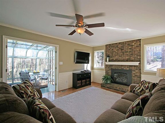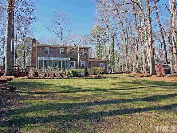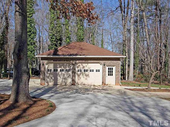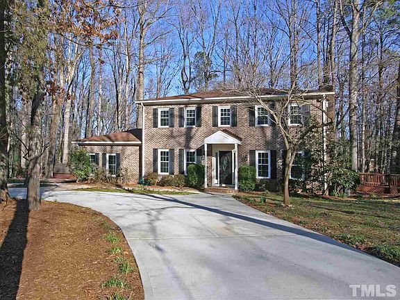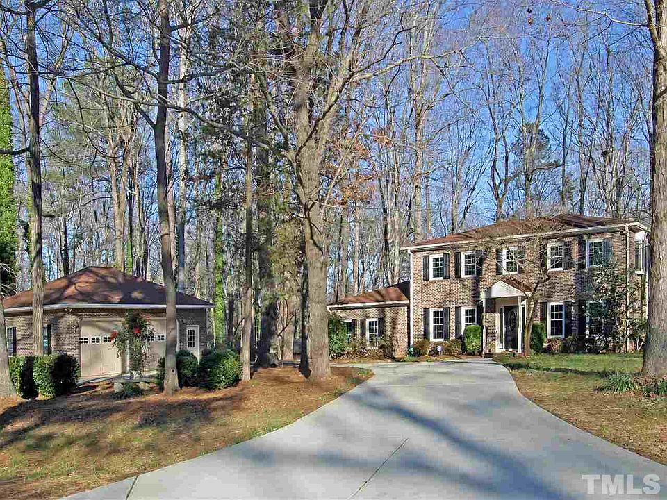 Traditional brick beauty on large wooded lot just minutes from the hub of Cary! Approximately an acre with gorgeous hardwood trees. Graceful circular driveway. Large detached garage with workshop space. Absolutely stunning sunroom overlooks huge backyard...plus family room with fireplace, recreation room, formal living room/office, kitchen with granite, formal dining room, breakfast room, four bedrooms with hardwood floors. Custom tile shower upgrade in master bath. Bay windows in breakfast and master.