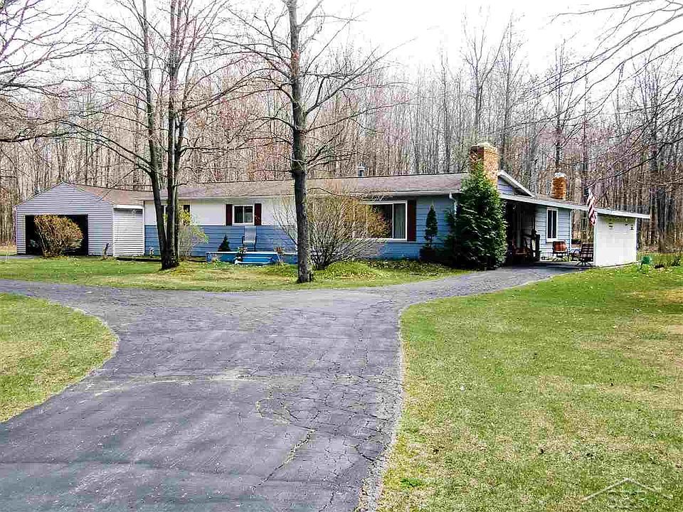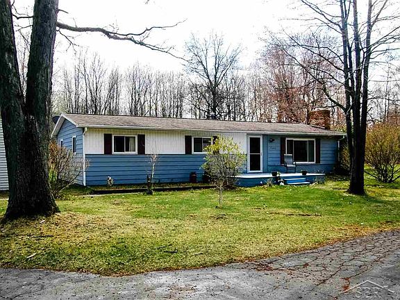 Welcome to the country! Enjoy the peaceful wooded setting and natures wildlife. 3 bedroom, 2 full bath home on 5 wooded acres. Home has living room with an electric fireplace and a family room with a glass slider to deck area. Patio off dining room. Circular drive. Maple Grove Township, New Lothrop Schools.