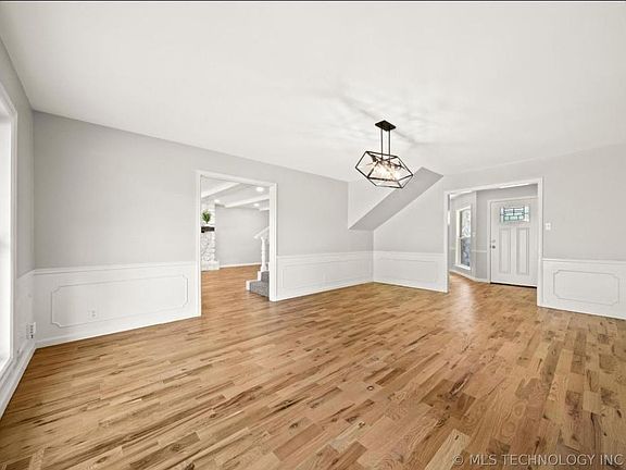 82" TV (already mounted in living room) and washer/dryer included! Large home in quiet neighborhood on corner lot off dead-end road and backs to city owned wooded property. Conveniently located near highways, Tulsa Hills, Page Belcher Golf Course, and Riverfield Country Day School.