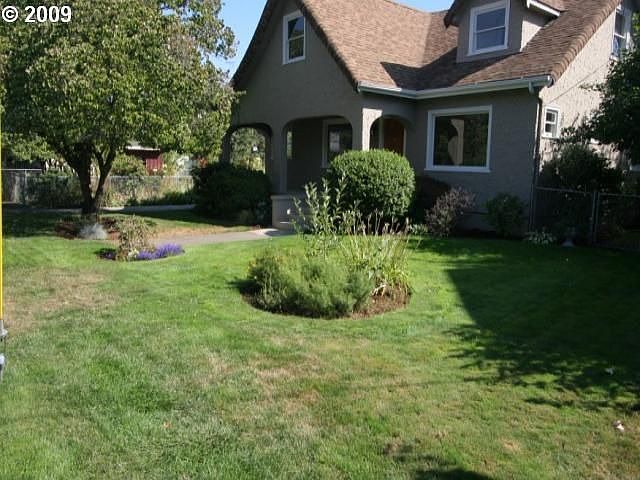 English cottage with four bedrooms, an upstairs office, jacuzzi tub room, an enormous garden, patio with fireplace, custom play house, basement wood stove, updated spray-foam insulation, and much more.