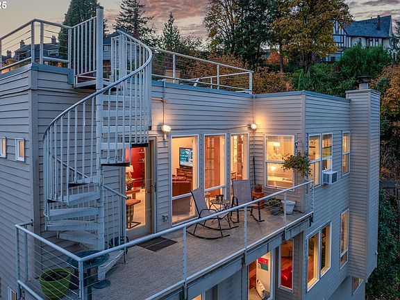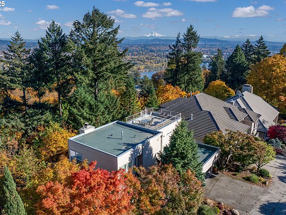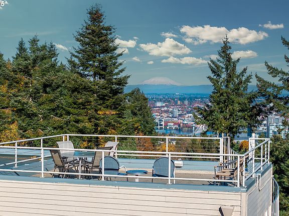 VIEWS VIEWS VIEWS! Smashing Condo Alternative in Terwilliger Heights With Mountain, City and River ViewsNestled on a tranquil dead-end street in the highly sought-after Terwilliger Heights neighborhood, this contemporary home offers stunning panoramic views and an unbeatable location. Designed to embrace natural light and capture breathtaking vistas, the open-concept main floor features soaring walls of windows and recently updated hardwood floors. Both the living and dining areas are enhanced by their own cozy fireplaces, creating a welcoming atmosphere.Upstairs, the luxurious primary suite with sitting area serves as a peaceful sanctuary, offering sweeping views that will take your breath away. A spacious bonus room, also on the upper level, opens to a private deck. A spiral staircase leads to an expansive rooftop deck—perfect for evening sunsets, intimate gatherings, or moments of solitude. The lower level is thoughtfully appointed with an office, a bedroom, and full bath, providing versatility and comfort.Located just minutes from OHSU, downtown Portland, Hillsdale, and the scenic Terwilliger walking paths, this home offers the best of both worlds—seclusion in nature with the convenience of city living. This home features beautifully landscaped low maintenance grounds.