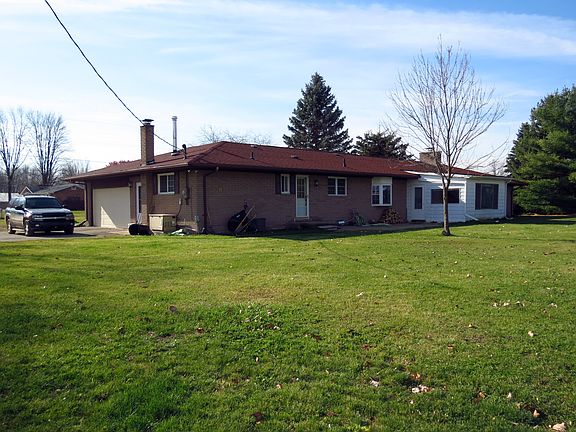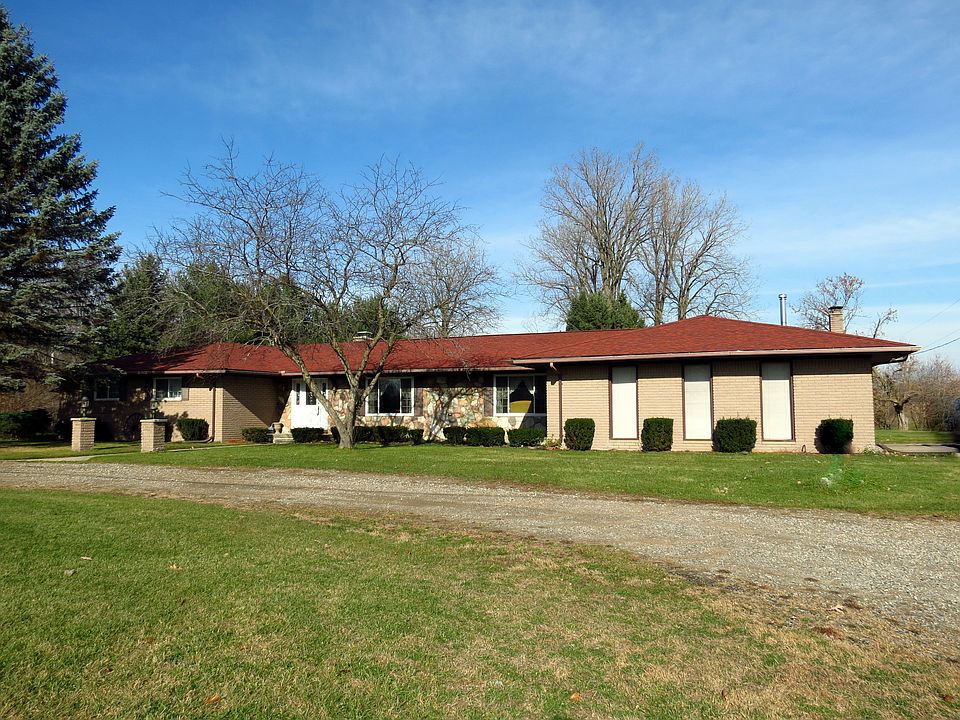 SPACIOUS RANCH HOME offering 2 acres of land nestled on quiet country setting. Easy maintenance brick & stone exterior with brand new roof. Large eat-in kitchen & breakfast nook has snack bar seating area, tray ceilings, lots of cabinets, & bay window w/ lovely view. Family room opens to kitchen & offers vaulted ceiling, natural brick fireplace, & door wall access to the 13 X 15 Florida room (195 sq ft not included in total sq ft.) Convenient laundry room adjacent to kitchen. Living & dining rooms enhanced w/ crown molding & large picture windows. Master suite features private ceramic bath w/ shower, crown molding accents, & two closets. Three spacious guest bedrooms. Ceramic tile in all baths. Full house LP powered gas generator. Oversized two-car garage perfect for storage. Lots of closets. Please exclude TV mount brackets.