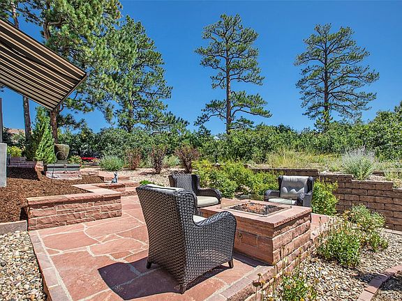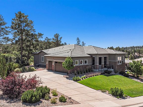 Enjoy stunning mountain views from this spectacular ranch style home in the prestigious Timber Ridge community of Castle Rock, Colorado. This incredible home sits on a premium .56 acre corner lot and offers an abundance of quality features and custom finishes that are a must see to appreciate. The spacious 5,644 sq.ft. open floor plan features a professional chef quality kitchen with a compliment of beautiful cabinets with lighting and glass inserts, Granite counters, stainless steel appliances with a gas cooktop, custom wood vent hood, upgraded lighting, decorative tile backsplash, and a huge pantry. The spacious family room will take your breath away. This incredible room has a cozy corner fireplace, 10' ceiling, extended wide-plank wood flooring, and is flooded with natural light through the large windows that perfectly frame the amazing outdoor views. Entertain in the elegant dining space with breathtaking Pike's Peak views. Pure relaxation awaits in the luxurious master suite. Here you will find a spa-like 5 piece en suite with an oval tub, and a huge walk-in closet. This remarkable floor plan offers a rare private Casita suite with interior and exterior access, and offers a full kitchen, family room, private laundry, and full bathroom. The main floor is complete with full and additional guest bathroom, full laundry room, and more! The professionally finished garden level basement is an entertainer's dream. Find a huge recreation room with full wet bar/kitchenette, 2 bedrooms, full bathroom, theater room, and 707 sq.ft. of storage! This home is an entertainer's dream in all seasons. The backyard is equally as impressive making you feel that you are relaxing in one of Colorado's most premier mountain resorts. Enjoy the towering pine tress, hand laid Redstone paver patio and walkway, gas firepit gathering area, immaculately manicured grass areas and more! Other features include Professional Fire Suppression System, and a Fully Finished 3+ Car Side Load Garage.