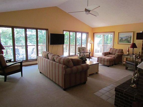 Lots of space in this nicely decorated and well-maintained home in an exclusive private community. Lg. eat-in kitchen. Living room with vaulted ceilings and fireplace walks out to large deck with water views. Lower level features another large living space with fireplace and walks out to patios also overlooking the lake. Included is a private easement with your own permanent boat lift just a short walk away. This spacious home is perfect for a large family or someone who wants a lake home with plenty of space for friends and family to gather!
