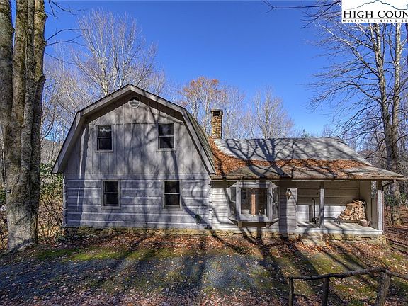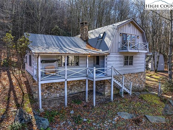 Lots of room in this home with 4 bedrooms. Plenty of outdoor space on the 4 acres. Downstairs is an open floorplan with Great Room, Kitchen and Dining area and a massive stone fireplace with a wood stove insert. The great room area ceiling features beams and tongue & grove ceiling. The front downstairs bedroom has adjoining full bathroom. There are 2 additional bedrooms and another full bathroom. Laundry area is in the hall near the downstairs bedrooms. Upstairs is the primary bedroom with a small balcony. Upstairs bedroom has a propane fireplace. Front porch is covered. Detached workshop and storage building. Below the home is a one car garage and crawl space. The home has a convenient back entry to easily unload groceries. Winter view. Hickory Nut Gap makes for a convenient drive to either Newland or Banner Elk. Wildcat Lake just minutes away.