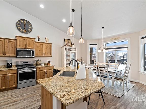 Discover the perfect blend of comfort and style at 5608 W. Hopwood St. This single level split bedroom home welcomes you with an 8 ft front door under the covered entryway, 9 ft ceilings throughout, and vaulted ceilings in the living room and master suite. Step inside to find a thoughtfully designed living space, highlighted by a tiled gas fireplace. The kitchen is a focal point, boasting granite countertops, large island w/ bar seating, stainless steel appliances, and an undermount sink. Relax and unwind in your master suite featuring a walk in tiled shower, dual vanities, and a spacious walk in closet. The massive rear covered patio extends the full length of the house and offers an ideal setting for entertaining or enjoying quiet evenings. Situated in the highly desired Avimor community, you’ll appreciate two community pools, a playground, community center w/ a gym, tennis and basketball courts, and easy access to walking/biking foothills trails. Don't miss the opportunity to call this your home!