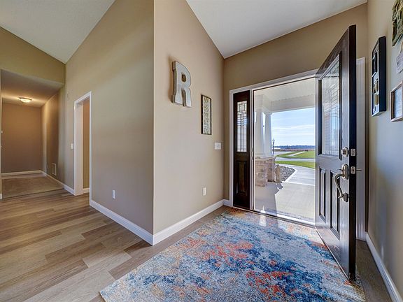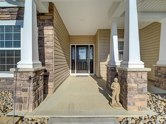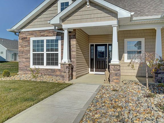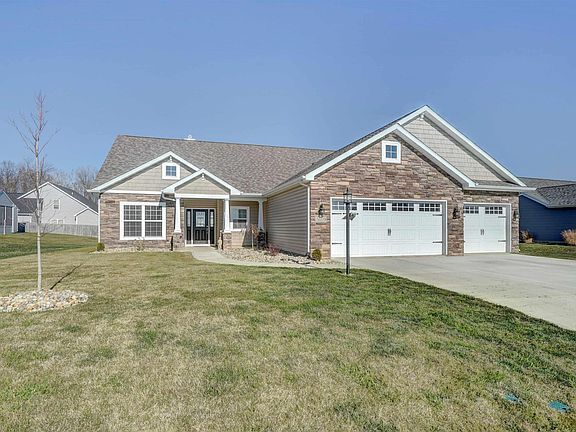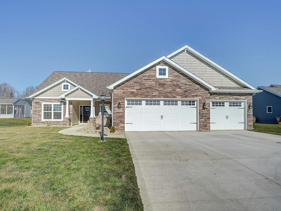 You may want to be the first ones to see this home! Absolutely beautiful home with stone and vinyl exterior, fabulous layout, lots of storage, and 3 car garage! Open concept with split bedroom plan. The foyer provides a welcoming area for family and guests and opens to the main living area and view. Special features include large 20' X 18' great room with vaulted ceiling open to the kitchen and 15' X 12' dining area. Very long kitchen island with soft close cabinetry, stone backsplash, walk-in pantry, and upgraded gas range. Dining area has a beautiful view of the pond and opens to a 16 X 11 covered porch. Extra large master bedroom with tray ceiling, storage under the window seat. Opens to a private bathroom with double vanity, large walk-in tile shower, and linen closet. Wait until you see how huge the walk-in closet and convenient laundry room are! This unique layout provides the opportunity to pass through the laundry room to an area with cubbies, entrance to the garage, half bath, and kitchen. At the other side of the home, a 2nd full bathroom with tub/shower combination is located between 2 nice sized bedrooms. All appliances and water softener stay except washer & dryer. Garage door openers for all bays. Irrigation system in front yard only; transferrable builder warranty with 1 year walk-through. Great condition, location, and price!