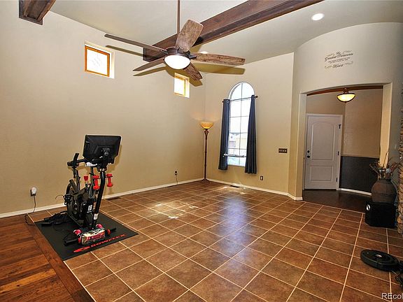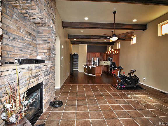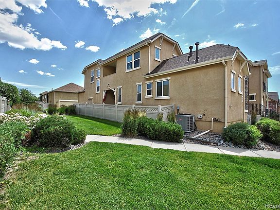 Enter through the front door turret into a spacious great room with a vaulted beamed ceiling, stone fireplace, and dark wood floors. The gorgeous kitchen is equipped with a double oven, stainless appliances, cherry wood style cabinetry and beautiful granite countertops. Enjoy a covered patio setting off the kitchen, perfect for outdoor dining or lounging. The main level master includes a 5-piece bath and huge walk-in closet with built-ins. Laundry and a powder room finish off this main-level living space. The upper level features 3 bedrooms, a full bath, and another covered patio. The lower level consists of a huge family room, wet bar and a theater room for entertaining. Additionally, the lower level includes a bath and spacious bedroom with a large closet, perfect for private guest space. This home offers you the opportunity to skip the yard work and enjoy main level living in a maintenance free community. Close to parks, shopping, hospitals, military bases and everything else the Powers corridor has to offer. Make it your own!