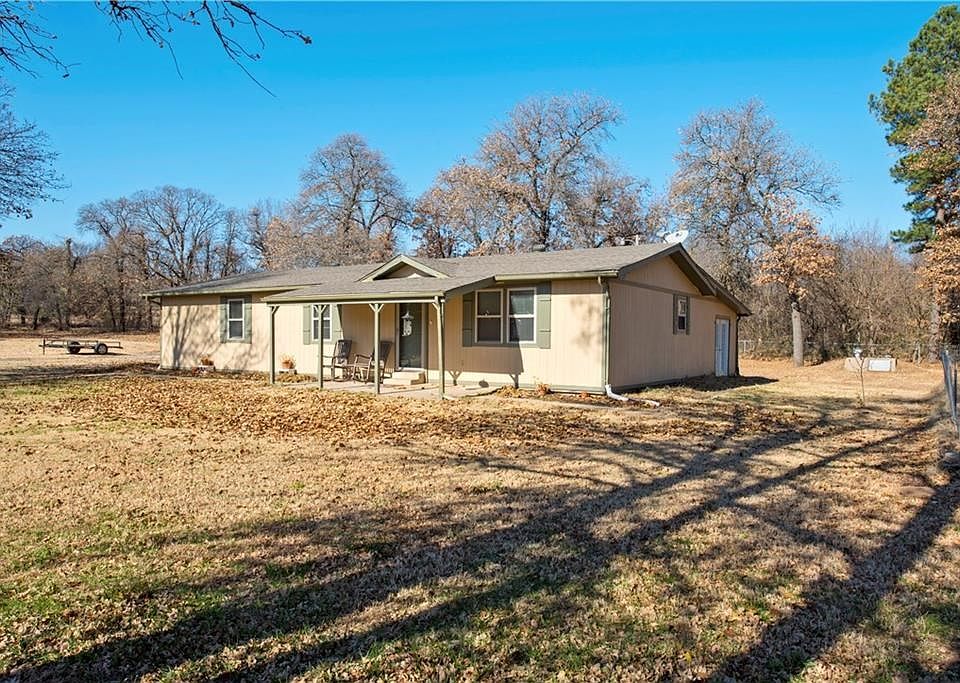 Beautiful Acreage Fully Fenced w/Trees, Pond, Underground Storm Shelter, Jones School District & Great Location! ENTIRE Home Update - Interior & Exterior - in 2018: 1) Paint throughout entire home 2) High Efficiency (23 SEER) HVAC (heat pump, electric air handler) added 3) WiFi Smart Thermostate added 4) High Efficiency Water Heater added 5) Laminate Wood Flooring in Kitchen, Bathrooms, Office, Laundry added 6) Exterior Siding over entire home replaced 7) Crown Molding in Living Room & Kitchen added 8) Kitchen Cabinets Painted 9) Formica Replaced on Island Countertop 10) Base Boards added throughout 11) Both Toilets Replaced 12)Shower Wall in 2nd bath replaced 13) Electric Swing Gate (marine grade battery, control board, receiver, transmitter) added 14) Work Bench in Garage added 15) Garage Door Springs replaced 16) Dirt Work for proper drainage to the Pond 17) Well & Septic Inspected & Plumbing Lines Professionally Cleaned 18) Chain link fence repaired / 120 Ft of Fence replaced
