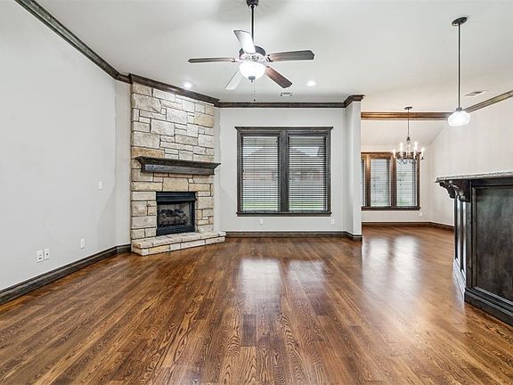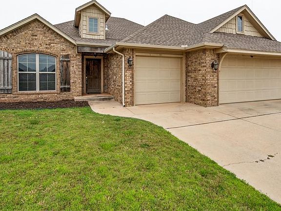 Welcome to this beautifully maintained home in the sought-after Silver Leaf addition, ideally located just minutes from Mustang schools, I-40, Kilpatrick Turnpike, and I-44—offering both convenience and comfort. With charming curb appeal, the rustic exterior features cedar accents, a sprinkler system, and a lush, landscaped yard. Inside, you'll find rich hardwood floors, 3cm granite countertops throughout, and an inviting open-concept layout perfect for entertaining. The spacious living room showcases wood-cased windows, crown molding, and a stunning stone fireplace. The kitchen is a chef’s dream with stainless steel appliances, sleek granite counters, gorgeous maple cabinetry, and a built-in oven. The private primary suite includes dual vanities, a jetted tub, wood-cased windows, and a generous walk-in closet. A dedicated study can easily serve as a fourth bedroom. Additional highlights include a 3-car garage, in-ground storm shelter, and charming mud bench. Welcome Home!
