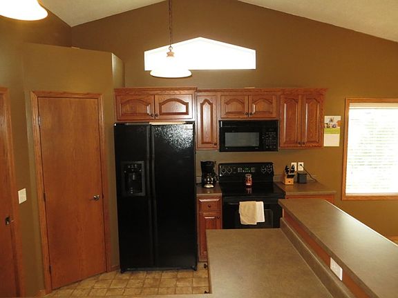 Ranch Walkout home resting in an excellent Northwest neighborhood. Step in to the spacious main floor with a very open floor plan, accented by large vaulted ceilings. Kitchen houses stylish black appliances, a comfortable breakfast bar, and a corner pantry closet. Main floor laundry is in a convenient location just off the kitchen. Living room features a massive South facing window to let in wonderful natural light. Main floor also houses two bedrooms including the master bedroom with walk in closet and a full bath. Bright and spacious lower level features an enormous walkout family room with an appealing gas fireplace and built in surround sound, a plentiful 3rd bedroom, and a second full bath. There is great separation between the backyard neighbors as this home backs up to a city greenway and it's easy to keep green grass with the sprinkler system. **Pictures are for marketing purposes only and not representative of items which remain with the sale and transfer of property.**