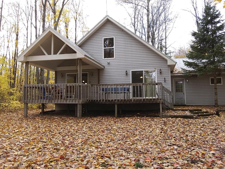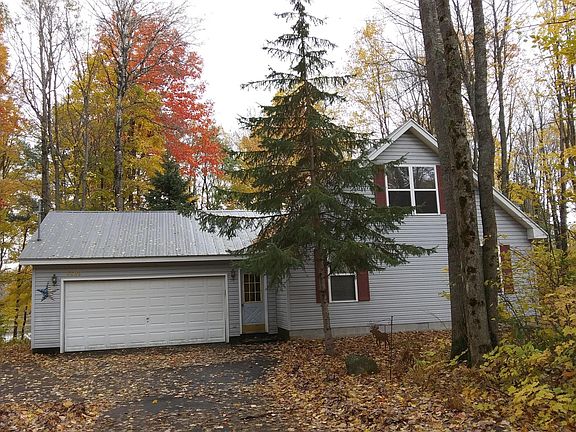Very well maintained vinyl sided Deer Lake chalet. Nicely wooded lot with great views of Deer Lake, and foot paths to waters edge. This 3 BR 2 Full Bath home also has a loft that could be used for additional sleeping area. Up North look and feel with knotty pine walls and vaulted ceilings, yet enough dry wall for that cozy feeling. The free standing gas stove is a nice supplement for heat. Forced air propane is the primary heat source. The 2 sets of sliders access the 250 sq. ft deck that overlooks the water. Part of the deck is covered and ready to be screened in. There is an additional 20x20 garage for all your toys. Cement drive way and metal roof on both buildings. This property could be either a primary or vacation home. Enjoy all the amenities Lakes of the North has to offer.