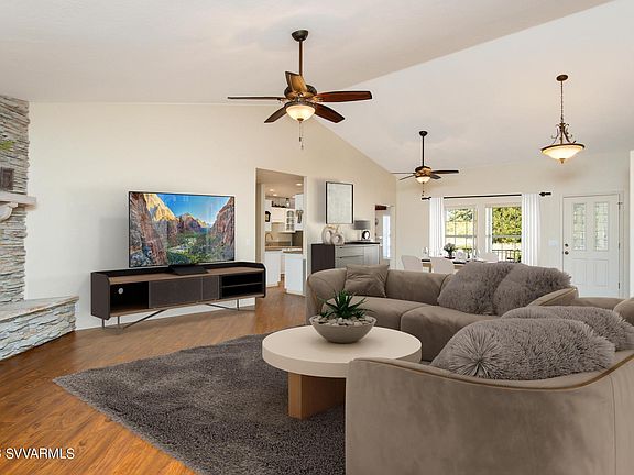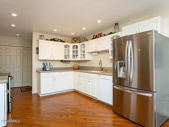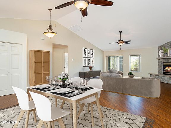 Desirable well established neighborhood, cathedral ceilings, corner rock fireplace, split floor plan, nice kitchen with eat-in area, living & dining area for larger dining experiences, Quartz Composite Counter Tops, all appliances stay, easy care landscape w/fruit trees, attached 2 car & detached 2 car garage. extra parking for RV (RV Dump & hookup near detached garage), Large Primary Suite with 2 walk-in closets, primary bath has tiled shower, AZ room for extra living space & storage, utility sink & water purification system (2021), mature trees also, Apricot, Pear, and Apple Trees, Fenced Backyard, drip systems, detached garage has wall AC unit. Must see to appreciate.