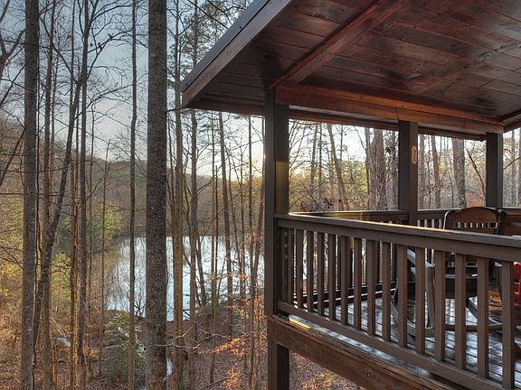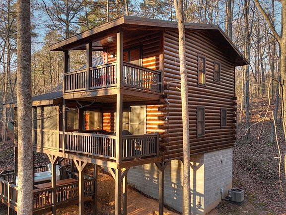 Charming lakeview living in the highly sought after Cherry Log Mountain Community! Flanked by a gently flowing creek and offering a view of the lake, this cabin is a haven for those seeking a peaceful retreat. It features 3 bedrooms, 2 full baths and an open floor plan, making it ideal for creating lasting mountain memories or rental property. In 2021, the cabin underwent significant updates including a new metal roof, state-of-the-art HVAC system, a relaxing hot tub and new essentials like a washer, dryer, and refrigerator. The owners suite, located on the upper floor, features an ensuite bath and a private deck, perfect for enjoying morning coffee while listening to the creek and gazing at the pond. The loft area, serving as the 3rd bedroom, offers ample space for kids to play and relax. The main floor is a hub of comfort and coziness with a large family room, wood-burning fireplace, an additional bedroom, a full bath, laundry facilities, and a kitchen with a dining area and extended bar. Outdoor living is equally inviting with a screened-in porch, an open deck ideal for grilling, and a lower patio area with a hot tub, picnic space, and a fire pit for evening gatherings. The level lot surrounding the cabin is perfect for outdoor games, pets, exploration, and fishing in the pond. This property needs to be experienced in person to truly appreciate the tranquility and beauty it offers.