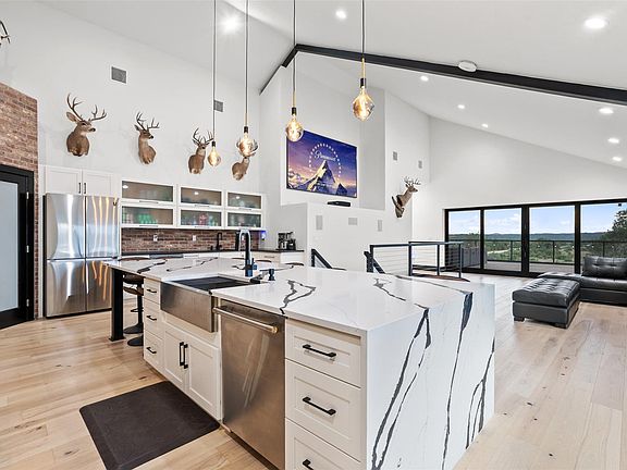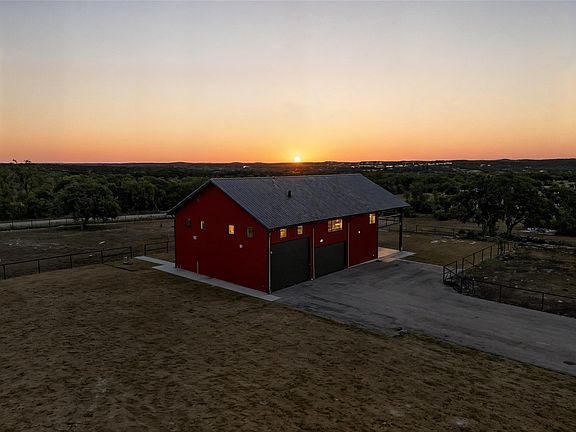 Astonishing Hill Country views surround this sprawling 4,950 sq. ft. barndominium, expertly constructed with robust 12” and 16” I-beam steel framing for unmatched strength and enduring quality. Set on 12.938 AG exempt acres, the property is framed by majestic oak trees and fully enclosed by a 5 ft no-step pipe horse fence, ready for your horses or ag animals. The residence offers 3,352 sq. ft. of luxury living space paired with a climate controlled 6 car garage and loft that can serve as an office, flex space, or guest retreat. A 30,000 plus gallon rainwater collection system with supplemental well, dual 500 gallon propane tanks, foam insulation, large energy-efficient fiberglass windows, and whole-home networking with smart home capabilities ensure modern comfort and efficiency. Inside, the gourmet kitchen boasts an oversized quartz island with seating for 10, premium appliances, a coffee and bar station, and a warm open concept layout highlighted by hickory wood floors, expansive windows, and abundant natural light. The owner's suite offers a spa-like retreat with a dual-head walk-in shower, soaking tub, and his and her closets. Each guest bedroom includes a private bath and a walk in closet, with laundry facilities on both levels for added convenience. Designed for seamless indoor outdoor living, the home features two expansive 900 sq. ft. patios and decks that are perfect for savoring Hill Country sunsets and breezes. Additional highlights include a full bath in the shop, durable coated flooring, and plumbing for a dog wash station.