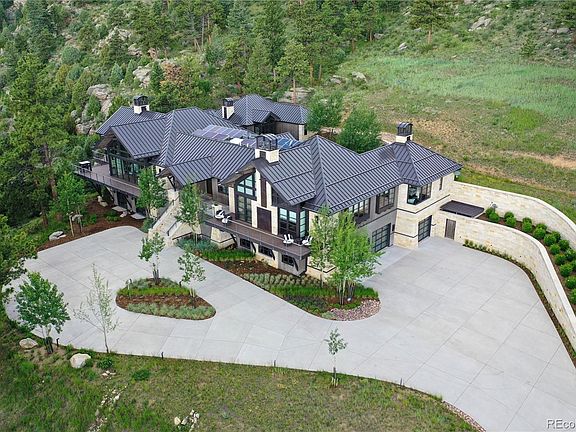 Featured in Luxe Magazine and located off prestigious Upper Bear Creek Road this recently built contemporary mountain elegant style designer home will take your breath away. Nestled on 18 private acres with gorgeous mountain and valley views, here serenity, security and privacy abound. Designed by renowned architecture-interior design firm Ruggles Mabe Studio, this is truly one of Colorado's exceptional listings. The dramatic, open concept great room is made for entertaining and fully opens to the outside decks. Bright and airy, with hand honed light limestone walls, steel and wood beam accents, floor to ceiling windows, French white oak smoked hardwood floors, and a retractable wall of windows that bring nature inside. The kitchen is a chef's dream, marble and granite abound, with waterfall granite surrounding an 8 burner Lacanche built in stove. The oversized great room includes an upscale bar area, with 400 bottle glass-enclosed temperature-controlled wine storage unit. The main floor flows naturally with wide hallways, including a loggia with windows to the grassy courtyard with water feature, landscaping and French limestone patio. The spectacular library-office has a steel patina fireplace, wall to wall shelves, and a floor to ceiling ladder. The master bedroom suite is your private sanctuary, accessed through a raised bridge hallway. The master bedroom suite is complete with a handmade wave pattern stone fireplace, walk out deck with steps to the private built in spa, custom closets, additional laundry, and a stunning master bath. Three additional bedrooms include a stunning guest master your friends will not want to leave. All bedrooms are en suite with gorgeous designer bathrooms. The home features an elevator and oversized garage that fits five cars. Any season of the year, the nature and views are inspiring. Plan to stay awhile when touring this exclusive masterpiece!