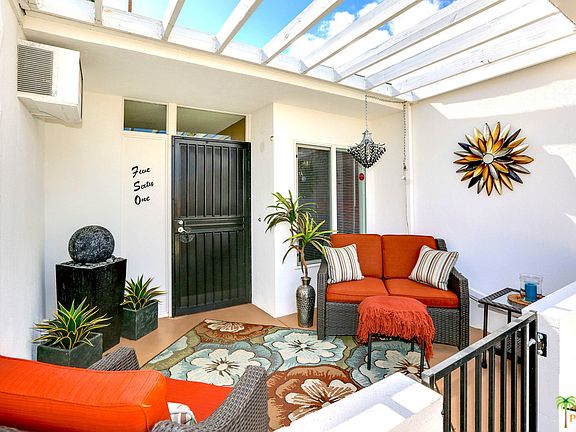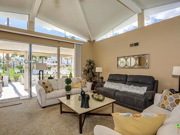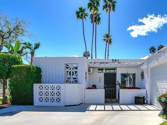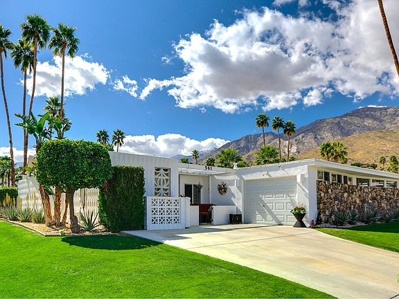 Architecturally significant Mid-Century Modern home designed by renowned architect William Krisel. This highly sought-after rare 3-Bed 2-Bath end-unit features a spacious Great Room with dramatic "umbrella" ceilings, clerestory windows on all four sides, walls of glass and sliders opening onto a large entertainer's patio overlooking the sparkling pool & spa and the spectacular mountains beyond. Spacious master suite with an upgraded bathroom has sliders opening onto the patio. Enlarged second bedroom with sitting or work area. Third bedroom is currently used as a den and has a fitted desk/home office. Remodeled kitchen with inside laundry room. Attached garage with storage is an added bonus.