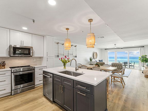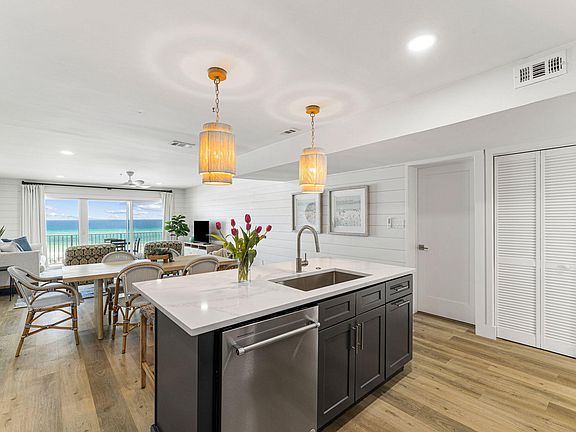 Offering a professionally curated design, this stunning Gulf-front two-bedroom residence at Commodore's Retreat fully encompasses the epitome of coastal living. Upon initial entry, the newly installed flooring leads way to the impressive living areas embellished with premium finishes and upgrades carried throughout. The gourmet kitchen features custom cabinetry flanked by white quartz countertops, a contrasting tiled backsplash, luxury appliance suite, and an extended island perfect for entertaining. The generously sized living and dining areas adorned with white shiplap walls and chic furnishings are anchored by the 180-degree views of the turquoise hued waters. Blurring the line between indoors and out, the covered terrace is the perfect place to admire the new palate of mesmerizing hues emitted by the renowned Emerald Coast sunsets each and every night. A true rarity, this residence is also positioned to enjoy views overlooking the Eastern Lake outfall connecting the rare coastal dune lake to the Gulf of Mexico.