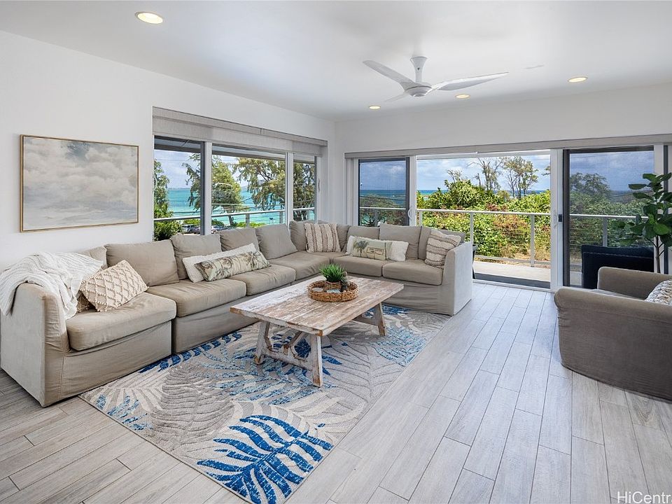 Location! Location! Location! This modern, well maintained, low maintenance home effectively built in 1994 with a permitted ADU (Accessory Dwelling Unit) is just above and across the street from world famous Kailua Beach! This rare purchase opportunity is the epitome of true Hawaiian Style Living with the perfect combination of gorgeous ocean views and tropical breezes! A contemporary open floor plan with an expansive Gourmet kitchen upstairs opens to two living areas, dining, and a large relaxing lanai overlooking the ocean. Two primary suites (one on each floor) offer the best of accommodations for you and your guests. The lower level features its own full kitchen, separate entrances, living room, dining area, bedrooms, bath and patio! Additional outdoor features include 40 owned PV Panels, solar hot water heating, a fully fenced yard, landscaping, irrigation system, outdoor shower, enclosed storage and additional beach equipment storage area. This is a fully furnished and appointed home with the possibility of being sold turn key, so just unpack your bags and make yourself at home in this rarely available beach location!