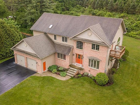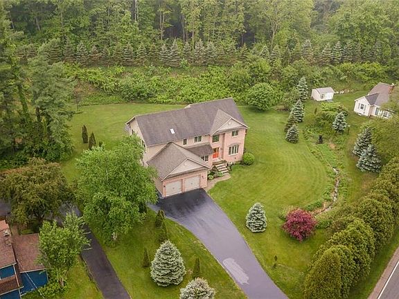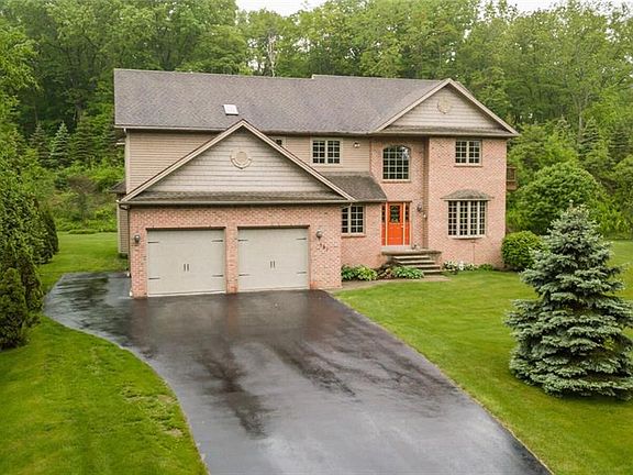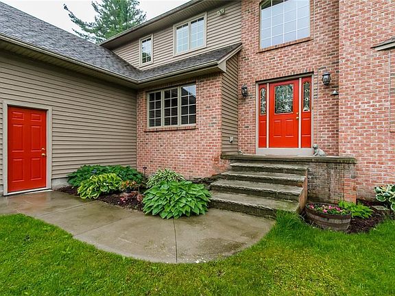 EXCEPTIONALLY BUILT custom home on over 1 acre wooded lot! Open floor plan with spacious eat-in Kitchen featuring cherry cabinetry & granite countertops leads into the Living Room with distinctive two story ceilings & gas fireplace. 1sr floor office has private entrance from garage. 1st floor Master Suite with double sinks, tiled shower & Jacuzzi tub! Master bedroom has separate entrance to deck. 2nd floor Family Room overlooks Living Room with private balcony. 4 bedrooms & separate office/flex space. Full hall bath features double sinks. Convenient second floor laundry! Superior construction of the full, partially finished basement with Western concrete floors that will not crack and 12" block walls. Premium Pella casement windows & Ultra high definition roof w/lifetime warranty. 2.5 car attached garage has Western concrete floors, loft storage space & 3rd garage door for easy access to yard. Enjoy the summer on the entertainment sized deck with built-in seating! Private access to Hojak Trail that connects to the Webster Trail System. Perfect for walking, biking, etc. Membership available to Forest Lawn Community w/access to Lake Ontario. 13 years NEW SUPERIOR BUILT HOME!