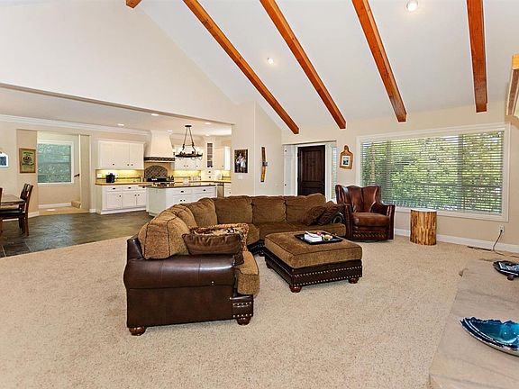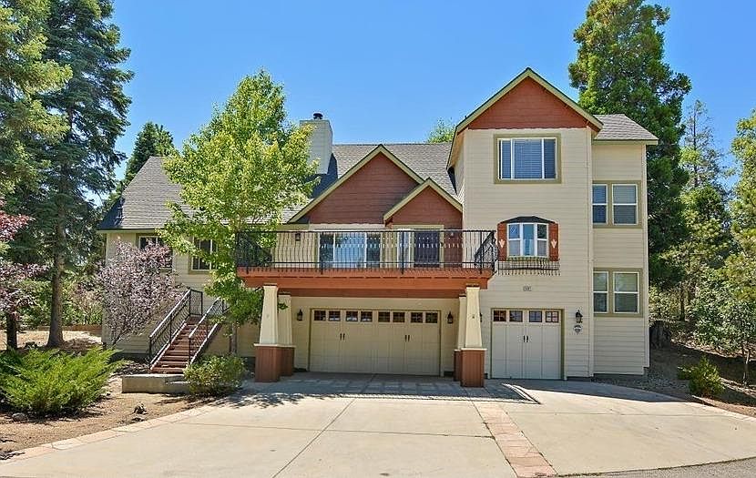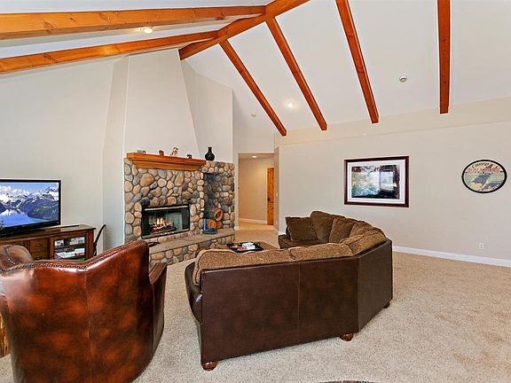 Gorgeous 3 bedroom, 3 bathroom, 3 car garage home welcomes a new buyer! Pass over the large front new Trex like product porch for main level entertaining at its finest and in through the new upgraded front door where you will be immediately impressed! Stunning open concept with extra-large granite island in kitchen open to both living room's vaulted ceiling with wood beams and a wood burning river rock fireplace. The kitchen is well appointed with stainless steel appliances, breakfast bar, adjacent dining area and counter space galore. Two Luxurious Master Suites with double-sided fireplaces, one with peek of lake and one with subway tile shower, separate tub, and dual vanities. Secondary bedroom with access to second deck. The outstanding level grounds boast a putting green and cement pad for future developing. These are certainly a coveted feature for mountain homes! In addition to a level yard we also have nice level parking & entry to garage (extra deep). Lake Rights, too!