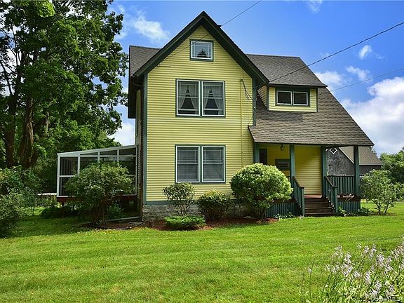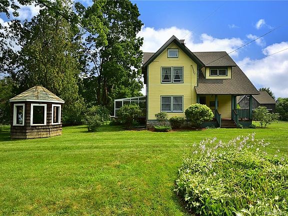 Tastefully decorated 9-room, 3-bath, farmhouse on a 2-acre lot with flower gardens, berries and fruit trees. Great choice of outdoor rooms. The house has two covered porches, a 3-season porch and a large mahogany deck with concrete pad and hook-ups for an optional hot tub. Eat-in kitchen features shaker-style cherry cabinets with antique copper hardware, soapstone counters, stainless steel appliances and a marble and butcher block island with microwave drawer. Sunroom behind the kitchen has 3 sky lights and includes a bathroom with shower and laundry as well as cabinets below a greenhouse window with a bar sink and full-size freezer. Formal dining room has a large bay window. Living has a Vermont Castings wood stove. Upstairs den features a large stone fireplace with gas logs. There are wood floors in most rooms. 24 x 36 post & beam 3-car garage with full second floor ideal for workshop or storage space. Whole house propane generator. Sunny open floor plan with many custom features and exceptional pride of ownership! New septic system 2021.