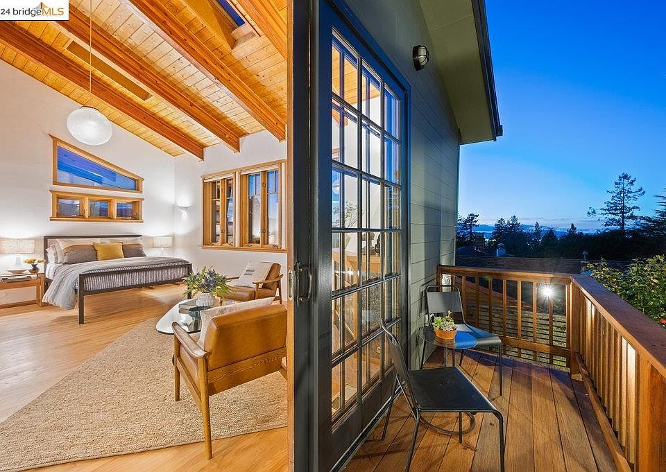 From the street, this 1952 house may resemble something from the space cartoon “The Jetsons,” but it is grounded in earthly pleasures. With a fantastic indoor – outdoor flow, almost every room in this house interacts with nature.*Level-in to an open living, dining room and kitchen area, there are sliding glass doors that connect from each space to the yard filled with mature fruit trees (fig, apple, plum, lemon & mandarin) encircling the house. Down the hallway are three bedrooms and a bathroom, each bedroom looking out to the verdant surrounds. The south facing one, has French doors that open to an intimate hot tub area.*Up a short flight of stairs is the double volume primary bedroom and loft office flooded with light. A small balcony looks onto the green Tilden hills, uninterrupted by other houses. To the west, you can see a bit of the bay and twinkling city views. Off the loft, there is an unenclosed flat roof (no kids) where there are more views all around.*Repleat w/ solar panels, backup bttry., electric car charger, 2 car garage, & grey water system. A 6-minute drive to North Berkeley or Kensington shops, & dwntwn. BART. Next to Tilden & Summit Reservoir Park.