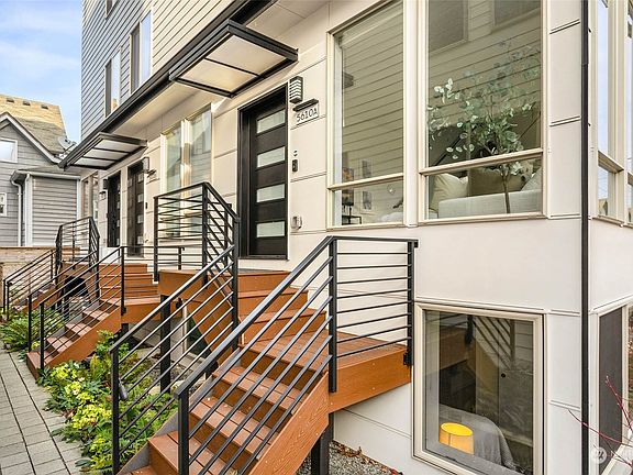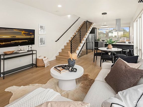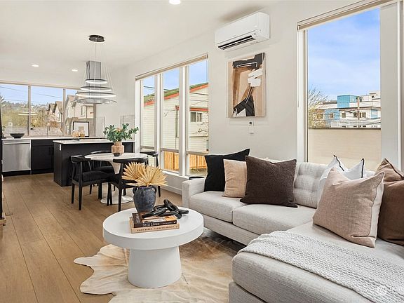 Fantastic location, steps from vibrant downtown Ballard yet peacefully perched just off 14th Ave. Huge windows flood the main floor living room, dining space, and kitchen in natural light. One floor up is the laundry room, 1 of 4 spacious bedrooms and beautiful designed full bathroom. The top floor shines with the owner's suite and spa-like bathroom with heated floors, views of Ballard, and access to roof top deck. The lower floor includes 2 more bedrooms, or a work from home space and another bold bathroom design. With AC, alley access to your designated parking spot, mountain views from the roof top deck, and proximity to Ballard, this move-in ready townhome is a rare find. No HOAs. End Unit. T&C Grocery across the street!