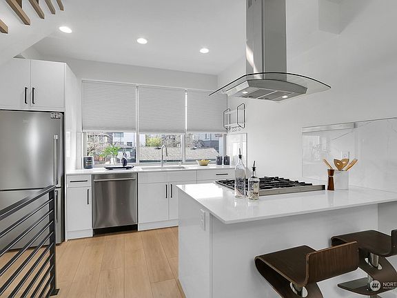 Exceptional 3BRs+Den residence is situated in the vibrant DT Ballard neighborhood, the property is steps away from local amenities, offering an excellent in-city location w/easy access to DT and SLU. Home features a modern, open floor plan w/ample natural light from oversized windows and high ceilings. Each of the bedrooms is thoughtfully designed, three boasting private baths. Chef's kitchen is equipped w/ a European appliance package & a stylish peninsula. Private suite offers tranquil retreat w/a spa-like bath. Modern hardware & lighting complement the sleek design. Rooftop decks via dropdown attic stairs w/remote control provide stunning views of the mountains and surroundings. Deeded off-street parking sitting away from busy street.