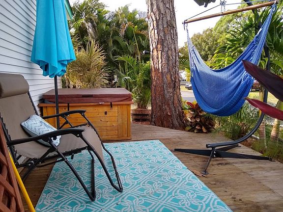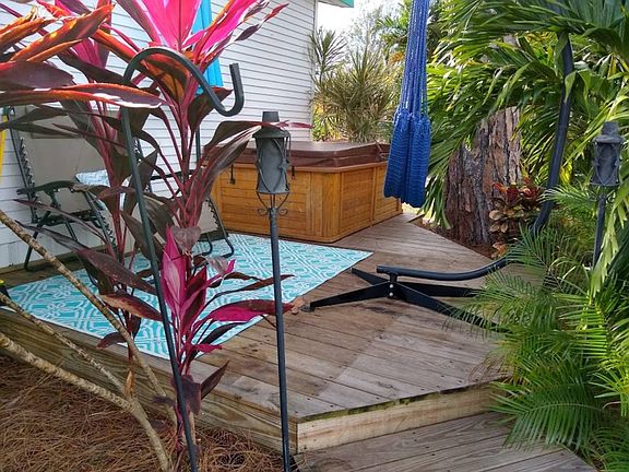 Cozy Cottage with deck and Hot Tub in Family Park! Pack up your car and bring your pets! This 2 bedroom cottage sits on a corner lot and has a huge sunroom, Turnkey...with beach décor... just bring your swimsuit! NEW roof, NEW SS refrigerator. Great outdoor living space here... covered porch and Hot Tub 1 1/2 yrs. old on custom deck surrounded by landscaping. Indoor laundry room & storage includes 6 yr old dryer and NEW washer! New electric panel. Come join the fun! Close to area Beaches, fishing, and Florida attractions. Park amenities include Pool, Fitness Center, Pet area, Shuffleboard & Pickleball plus close to shopping! Low lot rent of $522 includes sewer-water-trash, taxes and park amenities.