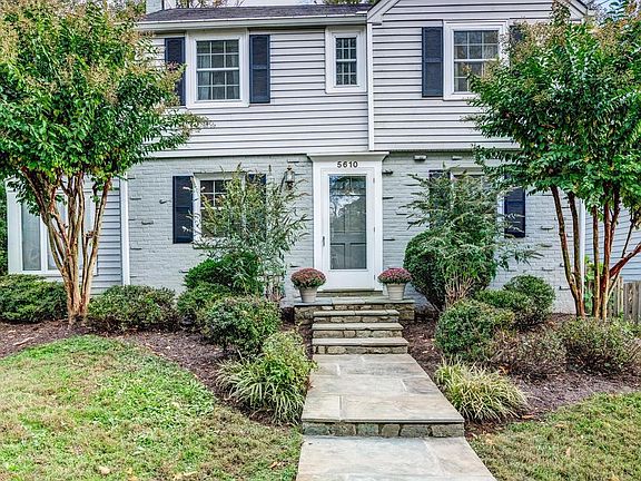 Offers, if any, due Tuesday, Jan 31 at 10:00 a.m. Located on a quiet street in sought-after Greenwich Forest, this classic four bedroom, two-and-one half bath Colonial features an abundance of natural light with gorgeous oversized windows throughout the home. Approached by a lush front yard with mature trees and a flagstone walkway, this lovely home enjoys a center-hall entryway leading to both the living room with a handsome fireplace, as well as to the open concept eat-in kitchen, creating superb flow. The living room leads to a spacious family room with high ceilings and French doors to a private back patio surrounded by the verdant, fenced-in backyard. The large family room provides flexible space for entertaining, dining, or movie night! Additional offerings include a first-floor powder room, a purposeful mudroom off of the private driveway, and a storage shed. The second level offers the primary bedroom with a sizable walk-in closet and an en suite full bath featuring dual sinks and a skylight. Three additional bedrooms and a full hall bath complete the second floor. There is an attic above for ample storage. A recreation room with a built-in desk, as well as laundry and storage areas with wrap-around built-in shelving can be found on the lower level of the home. With neighborhood parks near-by, 5610 Northfield Road offers tranquil living just steps to Greenwich Neighborhood Park tennis, sports courts, and playground. Known for close-knit neighbors and a friendly, casual atmosphere, 5610 Northfield Road is close Bethesda Trolley Trail, NIH, Suburban Hospital, downtown Bethesda, and major commuting routes. Residents use the local trails to stroll or bike to downtown Bethesda shops and restaurants. Whitman cluster schools serve the neighborhood. Welcome home!
