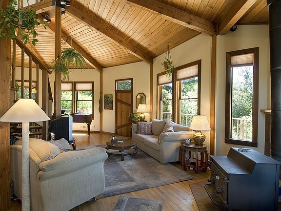 Exceptional Wine Country custom home, nestled between vineyards and majestic redwoods at the end of a private lane. Fabulous 2441 +/- spacious sq. ft. with great room feel. Hobby vineyard, garden area, fruit trees, pipe vine swallow-tail butterfly nursery, all combine to create a naturally beautiful setting. Built for outdoor living with a redwood wrap-around deck and hot tub overlooking the expansive vineyard views. Home features an open floor plan with a redwood spiral staircase, highlighting the skylight at the center. Master bedroom is on the main level. Extras include free standing wood burning stove, hardwood floors, solar hot water assist and 600 +/- sq. ft. basement.