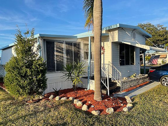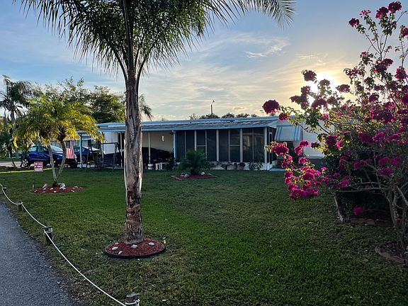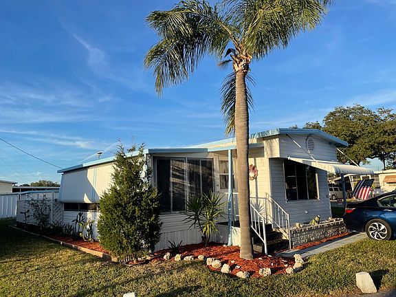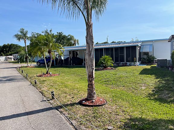 Located on a corner plot surrounded by a kaleidoscope of luscious greenery, trees and flowers, you will find this cheerful 2 bedroom 1 bath home. This home offers a refrigerator, range and microwave. The washer and dryer are included in the sale of the house and they are 1 year old. There is a bright kitchen, a beautiful Florida room that has a divider making it 3 bedrooms. There is a lanai, carport and a detached storage shed. The lot rent is 518.00 which includes water and trash. This home is in Carlyn Estates, a 55 year old community that offers a clubhouse and is pet friendly. Let me invite you to call me to see this home, you will not be disappointed, it could be just what you are looking for. All listing information is deemed reliable but not guaranteed and should be independently verified through personal inspection by appropriate professionals. Integrity Mobile Home Sales cannot guarantee or warrant the accuracy of this information, measurements or condition of any property. Measurements are approximate. Lot rent subject to change.