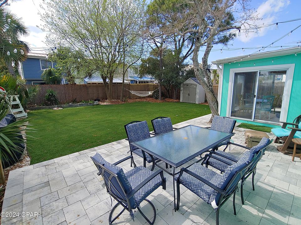 Step into your backyard paradise complete with a large paver patio perfect for entertaining, grilling your fresh catch, or catching some sun, and delivers an enchanting scene after the sun has set with the decorative lighting showcasing the patio. Stone landscaping borders and artificial turf provide low maintenance and high enjoyability. A shaded hammock will lull you to sleep listening to the breeze blow through the leaves, and occasionally the waves crashing on the white sandy beach. Numerous palm trees, pines, and other foliage offer a natural coastal setting.