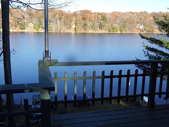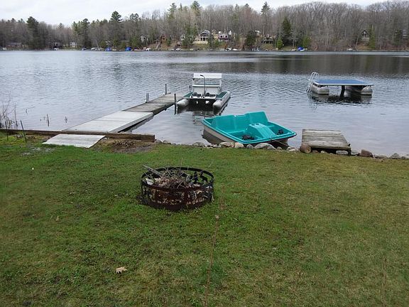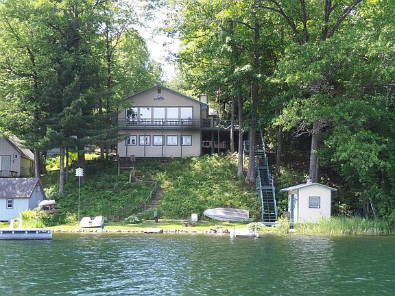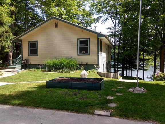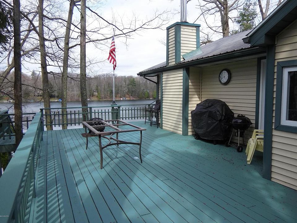 FOUR BEDROOM, 2 BATH, YEAR ROUND HOME ON BEAUTIFUL(AND PRIVATE) BLUE LAKE IN SHERIDAN TWP.- Enjoy 90 ft. of private frontage and over 250 acres of private association land at the end of your driveway. This home has been remodeled and maintained with TLC over the past 12 years. Maintenance free exterior including steel roof. Views of the lake from the main living area are spectacular. Over 800 s.f. of deck space is great for entertaining. Flat and grassed shoreline area is perfect for camp fires,outdoor games, sunbathing and watercraft storage. Home features a newer and efficient 3 zone heating system that also supplies the high-end water heater. Main floor wood burning fireplace is equipped with a high efficiency insert. Home features a generator powered electric transfer system for